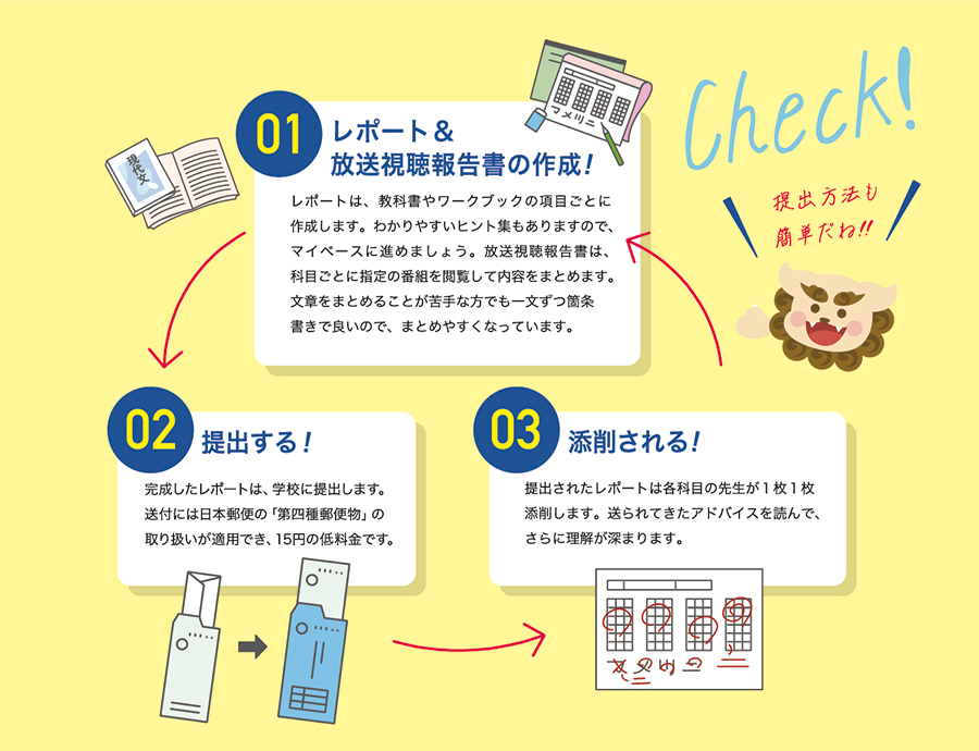 送られてきた教材を使って学習し、リポートの問題を解いて学校に提出します。